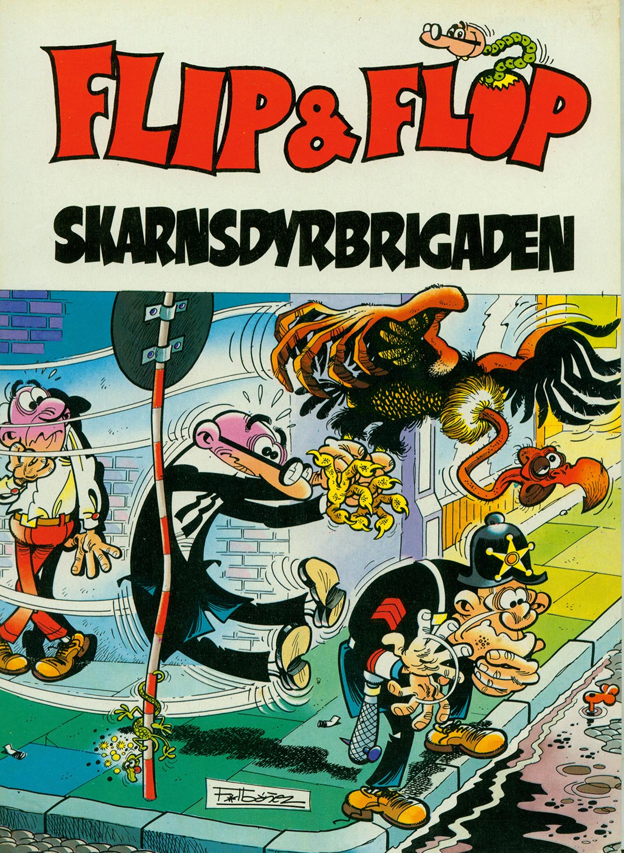 FLIP OG FLOP FRANCISCO IBANEZ Francisco Ibáñez Talavera (f. 15. marts 1936, Spanien) er en af de mest populære spanske tegneserieskabere mest kendt for sin serie Mortadelo y Filemón/Flip og Flop. Efter at have studeret bogføring og en bankvirksomhed, fik han job på Banco Español de Crédito. Hans sande passion var imidlertid tegneserier, og han begyndte at tegne for tidsskrifterne El Chicolino, La Risa og Paseo Infantil. Han var 21 år, da han besluttede at forfølge en professionel karriere i tegneserier og afslutte sit arbejde hos banken. Han sluttede sig til forlaget Bruguera, hvor han hurtigt etablerede sig som en af de vigtigste kunstnere. Efter nogle første publikationer i DDT startede han sin berømte Mortadelo y Filemón, Agencia de Información i Pulgarcito i 1958. Denne tegneserie var et fantastisk hit for sin absurde humor og dynamiske stil og fik i sidste ende sit eget blad Mortadelo i 1970. Mortadelos popularitet er ikke begrænset til Spanien - oversatte publikationer er fulgt i Tyskland, Danmark, Finland, Portugal, Italien, Holland og Belgien. Mens han fortsatte med at arbejde på sin hit-serie, skabte Ibáñez flere nye serier. Også for Pulgarcito kom han op med La Familia Trapisonda i 1958. I bladet Tio Vivo begyndte han serien 13, Rue del Percebe (1961), Rompetechos (1964) og Pepe Gotera y Otilio (1966). Han fortsatte også sit samarbejde med DDT med El Botones Sacarino (1963), en serie, der var stærkt påvirket af André Franquins 'Gaston Lagaffe'. Andre kreationer er Tete Cohete og Don Pedrito. Den stigende efterspørgsel efter Ibáñez' arbejde, på et tidspunkt producerede han ca. 20 sider om ugen, resulterede i, at Bruguera ansatte andre kunstnere til spøgelsestegnere på kortere historier med hovedroller i Ibáñes figurer. Ibáñez forlod Bruguera i 1985 og kom til Grijalbo. Da Bruguera havde rettighederne til figurerne, måtte han udvikle nye til Grijalbo magasinet Guai!, som Chicha, Tato y Clodoveo og 7 Rebolling Street. I 1988 nåede han til en aftale med Ediciones B., efterfølgeren til Bruguera. Han fortsatte med at producere omkring 6 'Mortadelo y Filemón' albums om året, mens han også fortsatte sine andre favoritter 'Rompetechos' og den grafiske nyskabende 13, Rue del Percebe/Gak-gak gade 13, som debuterede den 6. marts 1961. I 1994 modtog Ibanez Grand Prize under Salón Internacional del Cómic de Barcelona for hele sit livsværk, og i 2001 blev han tildelt guldmedaljen for sin kunstindsats. |